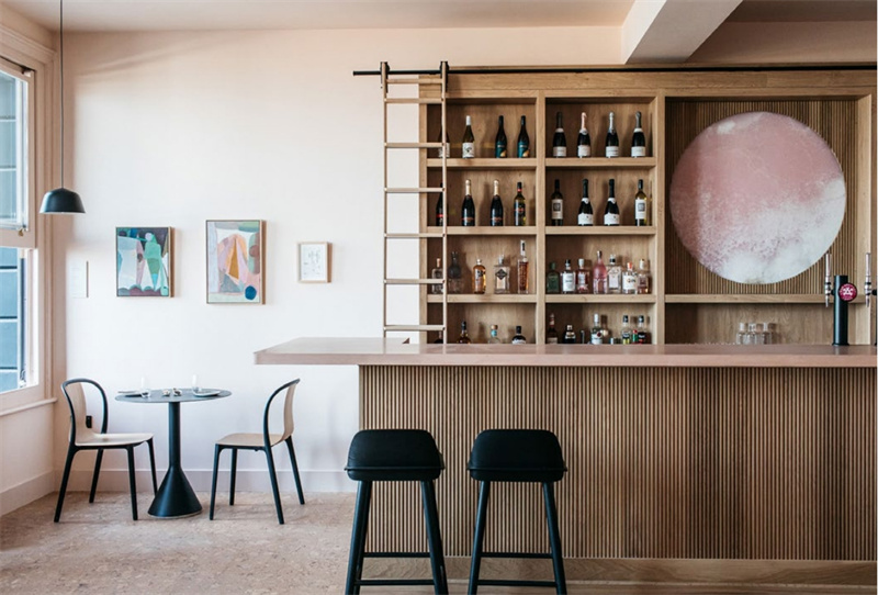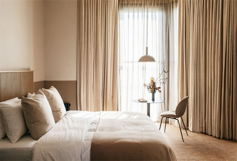 無論是酒店套房內還是吧臺休憩區,軟木地板天然的紋理色調與場景中的元素相輔相成,營造出柔和溫暖的主基調。軟木柔軟保暖的性能,讓整個空間透出靜謐之美的同時,又給予了其家的溫度。